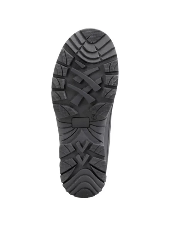 Bottine fourrée en croûte de cuir de vache et textile, à bout rond, montée sur une semelle antidérapante avec bouclier en caoutchouc. Chausson amovible en feutre avec enduction polyuréthane et coutures soudées pour une parfaite isolation et imperméabilité.
