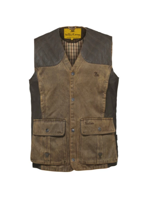 Gilet de chasse résistant. 57 % coton 43 % polyester.Doublure 65 % polyester, 35 % coton. Empiècements contrastés et matelassés aux épaules 100 % coton. 2 grandes poches basses à soufflet, 2 poches repose-mains,
