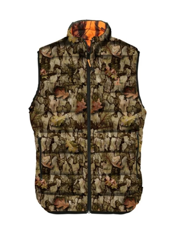 Gilet réversible, 100% polyester, rembourrage 100% polyester, doublure camo 100% polyester. Traité déperlant, peut supporter une pluie légère. 2 poches basses zippées, 2 poches intérieures. Pochon de rangement pour transport facile. GC B&B normé CE.