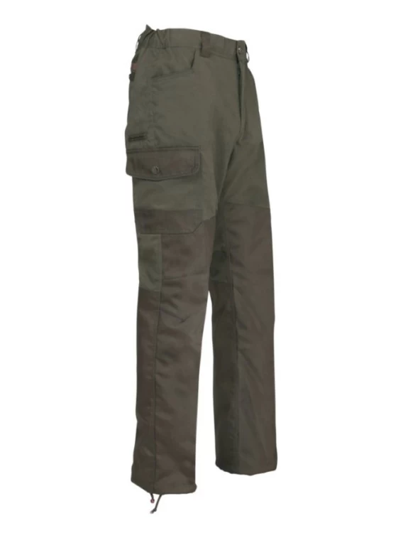 65% polyester, 35% coton, traité déperlant. Renforts 100% polyester, imperméables et résistants. 5 poches ceinture antiglisse élastiquée, bas à lacets.