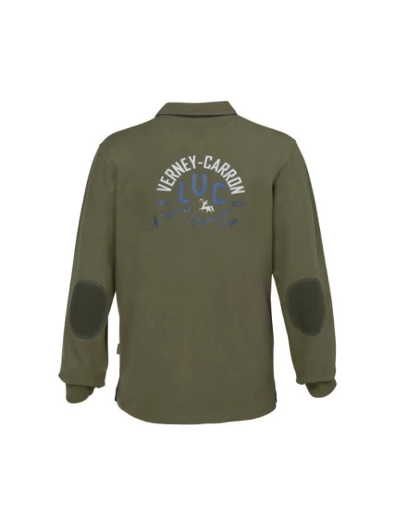 Polo de chasse de la marque Ligne Verney-Carron. Ce modèle à manches longues est en vert kaki. Il a une impression floquée au niveau de la poitrine et une autre plus grande dans le dos qui représentent le logo du fabricant.