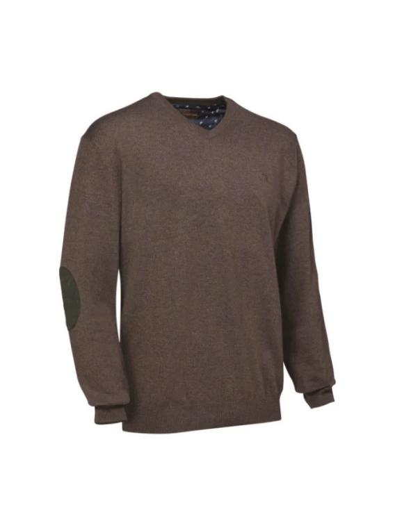 Pull fin, col V peu profond, 50% laine, 50% coton, coudière en opposition de couleur